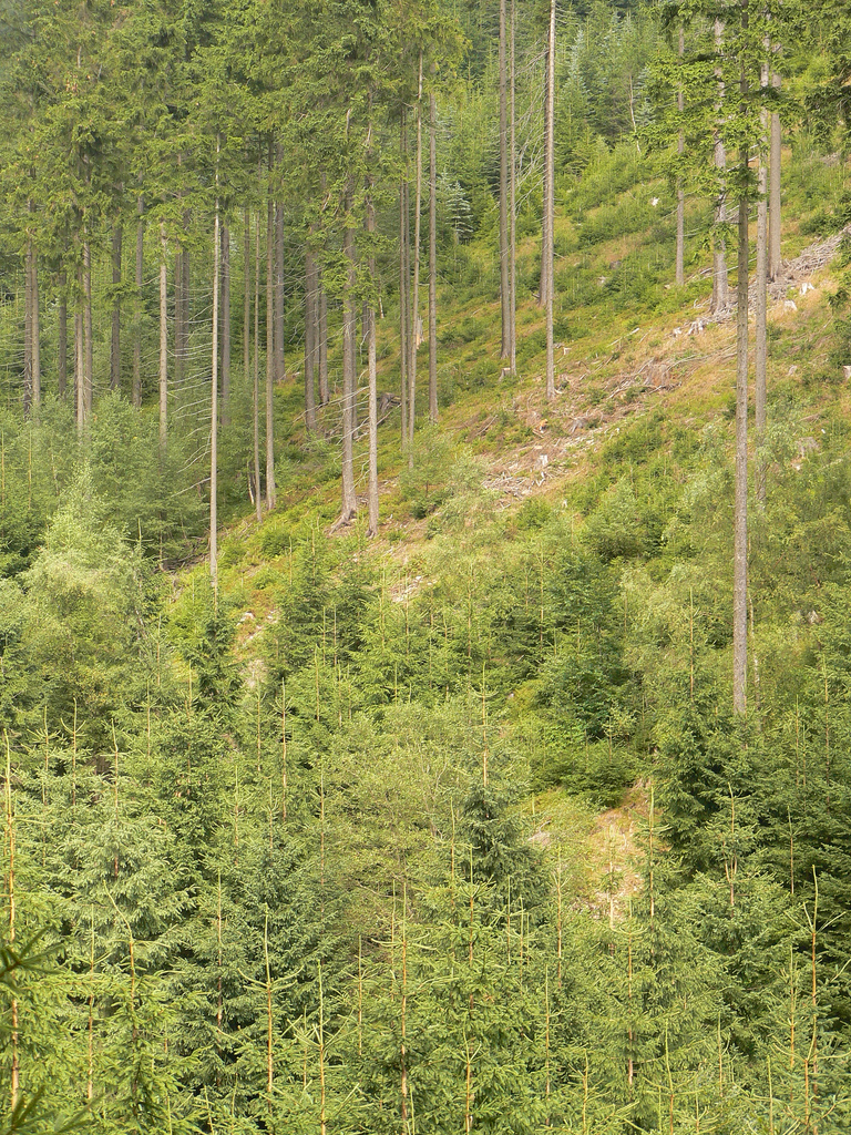 Prolific Norway Spruce regeneration adjacent to a light canopy of mother trees. These provide the seeds for natural regeneration without having to replant. The trees are growing in the mountains near Jachymov, Karlovarsky to the N.W. of Praha (Prague) in the Czech Republic. Permission to use this photo has been kindly granted by abejorro34 and appears in his Flickr photo albums http://www.flickr.com/photos/abejorro34/with/4896848449/ |