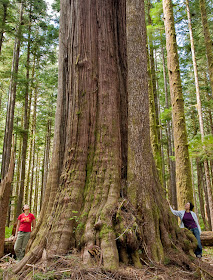 | This huge cedar known as the Elephant Foot Tree stands as a lone giant in the forest. It stands along the Gordon River near Port Renfrew on Vancouver Island. This tree lacks any legal protection in an area that is open to logging. Photo by TJ Watt of the Ancient Forest Alliance and taken from their Biggest Trees Gallery |