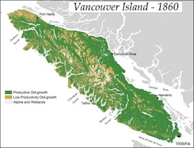 | A map of Vancouver Island from 1860 showing the extensive old growth forest that once blanketed the island |